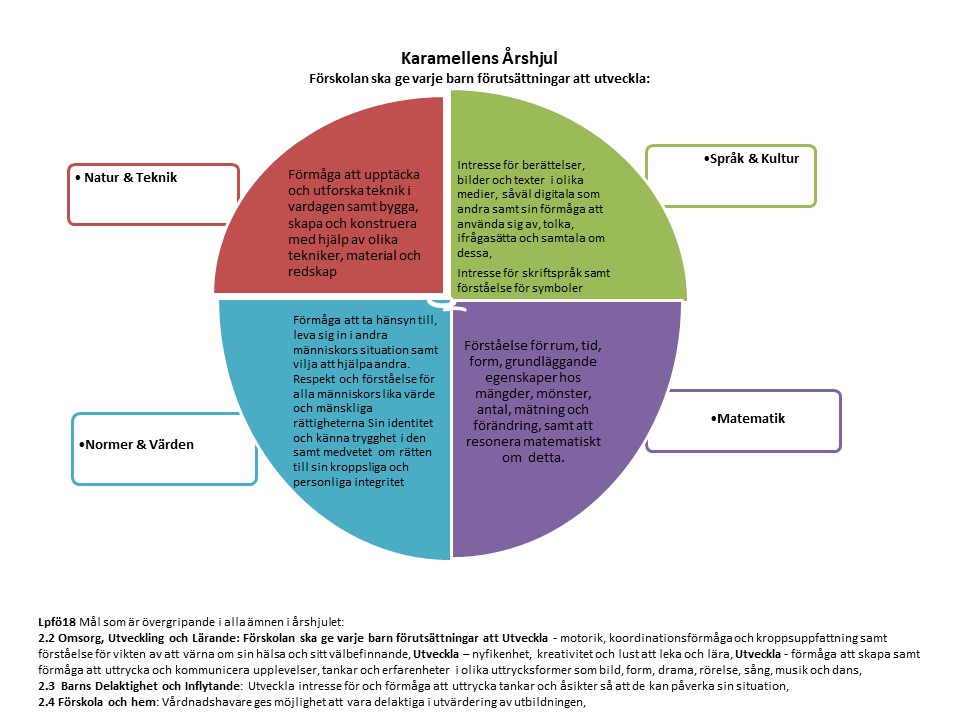 2.2 Omsorg, Utveckling och Lärande: Förskolan ska ge varje barn förutsättningar att Utveckla – motorik, koordinationsförmåga och kroppsuppfattning samt förståelse för vikten av att värna om sin hälsa och sitt välbefinnande, Utveckla – nyfikenhet, kreativitet och lust att leka och lära, Utveckla – förmåga att skapa samt förmåga att uttrycka och kommunicera upplevelser, tankar och erfarenheter i olika uttrycksformer som bild, form, drama, rörelse, sång, musik och dans,